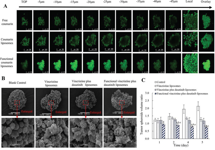 To evaluate the destructive effects of different formulations, MDA-MB-231 tumor spheroids were collected in 6-well culture plates and then treated with varying formulations at a concentration of 1 μM vincristine or dasatinib. Culture medium was used as a blank control. After incubation for 48 h, the spheroids were fixed by 2.5% glutaraldehyde for 60 min, rinsed three times with PBS, dehydrated and embedded. The spheroids were subsequently observed under a scanning electron microscope (SEM, JSM-5600 LV, JEOL, Japan).