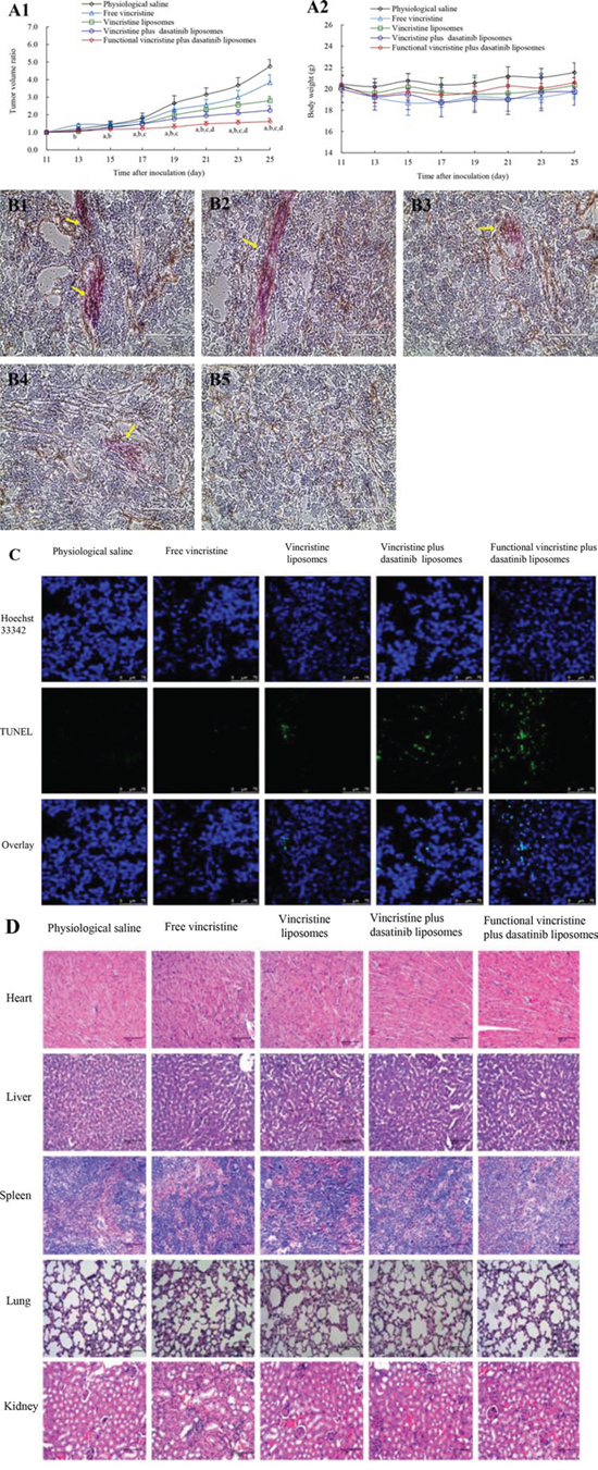 Figure 8: Antitumor efficacy in tumor-bearing nude mice xenografted with MDA-MB-231 cells after treatment with functional vincristine plus dasatinib liposomes. Notes: Tumor volume ratio A1. and body weight changes A2. after treatments. Data are presented as the mean ± SD (n = 6). p < 0.05, a, vs. saline; b, vs. free vincristine; c, vs. vincristine liposomes; d, vincristine plus dasatinib liposomes. The destructive effect on the VM channels in nude mice after treatments with B1. physiological saline, B2. free vincristine, B3. vincristine liposomes, B4. vincristine plus dasatinib liposomes, and B5. functional vincristine plus dasatinib liposomes. C. TUNEL assay of the tumor tissues after treatments of varying formulations (scale bar = 75 μm). D. Histopathological observations of the heart, kidney, liver, lung, and spleen of tumor-bearing nude mice xenografted with MDA-MB-231 cells after treatments of varying formulations (scale bar = 100 μm).
