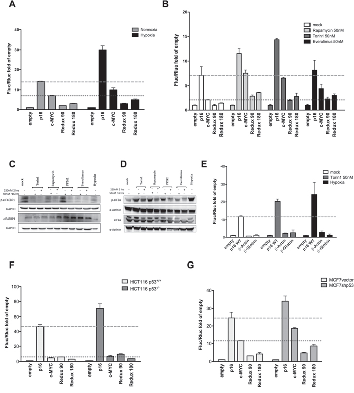 Figure 2: Hypoxia and different mTOR inhibitors enhance p16INK4a 5′UTR mediated translation. MCF7 cells transiently transfected with the different pRuF reporter constructs were grown in normoxic or severe hypoxic conditions A. or treated with mTOR inhibitors (Rapamycin, Torin1, or Everolimus) B. each at 50nM for 16 hours. Luciferase assays were performed as described in Materials and Methods and presented as described for Figure 1D. The individual Firefly and Renilla reporters’ values are shown in Figure S2A and S2B. C, D. Western blot analysis showing the effect of mTOR inhibition and hypoxia treatments on eIF4E-BP1 phosphorylation status C. or on eIF2α phosphorylation D. MCF7 cells were treated with two different concentrations of the indicated drugs (250nM for 2 hours or 50nM for 16 hours). The expression of total eIF4E-BP1 or total eIF2α were used as controls. GAPDH or α-Actinin endogenous levels served as reference proteins. E. The impact of mTOR inhibition (analyzed with the two most effective treatments, 50nM Torin1 and hypoxia) was evaluated on the p16INK4a 5′UTR sequence and two pRuF constructs containing the β-Actin and β-Globin 5′UTRs negative controls. The individual Firefly and Renilla reporters’ values are shown in Figure S2C. F, G. Luciferase assays were also conducted using the same reporter constructs in HCT116 p53+/+ and p53-/- cells F. or in MCF7vector and MCF7shp53 G. Dashed lines mark the activity of the p16 or c-MYC constructs in the mock condition, to better highlight the impact of the various treatments.