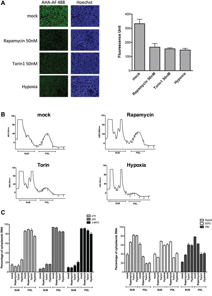 Figure 3: p16 mRNA retains polysomal loading in conditions of global translation inhibition caused by hypoxia or mTOR inhibitors. A. SK-Mel-28 cells were cultured in hypoxia or treated with mTOR inhibitors (50 nM Rapamycin or Torin1) for 16 hours. The effect on global translation was quantified by imaging the relative incorporation of the methionine analog (AHA) using the Operetta High Content Imaging System (see also Supplementary Information). Nuclei were stained using the fluorescent dye Hoechst (left panels). On the right panel a quantification of the Alexa-Fluor 488 signal is presented. Bars represent averages and standard deviations of four biological replicates. B. Cytoplasmic lysates of SK-Mel-28 cells treated as for the experiment of panel A were subjected to sucrose-gradient ultracentrifugation. Polysomal profiles obtained after the various treatments are shown. Fractions corresponding to subpolysomes (40S, 60S and 80S) and polysomes (two or more ribosomes) were pooled together for RNA extractions as indicated. C. Relative quantification by qPCR of the p16, p53, c-MYC (left panels), Rps20, EEF2 and VIM (right panel) mRNAs. Bars plot the average percentage of cytoplasmic mRNA present in subpolysomal or polysomal fractions. The standard deviation of two biological replicates and a total of six technical replicates are shown. Results were normalized for RNA extraction and retrotranscription efficiency using a spike-in synthetic mRNA (see Methods). The total amount of recovered mRNAs from subpolysomal and polysomal fractions for each condition was measured to present the data as percentage of cytoplasmic mRNA. For the genes in the right panel, the treatments led to an increase in the proportion of the mRNAs in subpolysomal fractions compared to the polysomal fractions, with the exception of Rapamycin for EEF2. This pattern was not observed for p16, p53 and c-MYC mRNAs, indicating that their association with the polysomes does not change even when cells are reducing translation (see panel A).