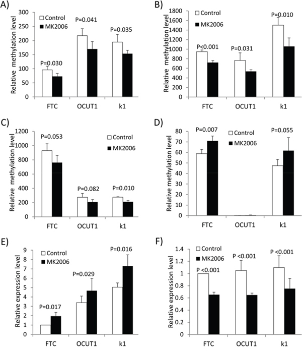 Figure 2: Validation of methylation microarray results by quantitative PCR. A–D. Validation of the AKT inhibitor MK2006-induced methylation changes of CDKN2D (A), REC8 (B), GSPT1 (C) and ADORA2B (D) by QMSP. E. and F. Expression analysis of REC8 (E) and ADORA2B (F) by qRT-PCR. Paired T-test was used to examine the statistical significance of the methylation or expression difference of the respective genes before and after treatment.