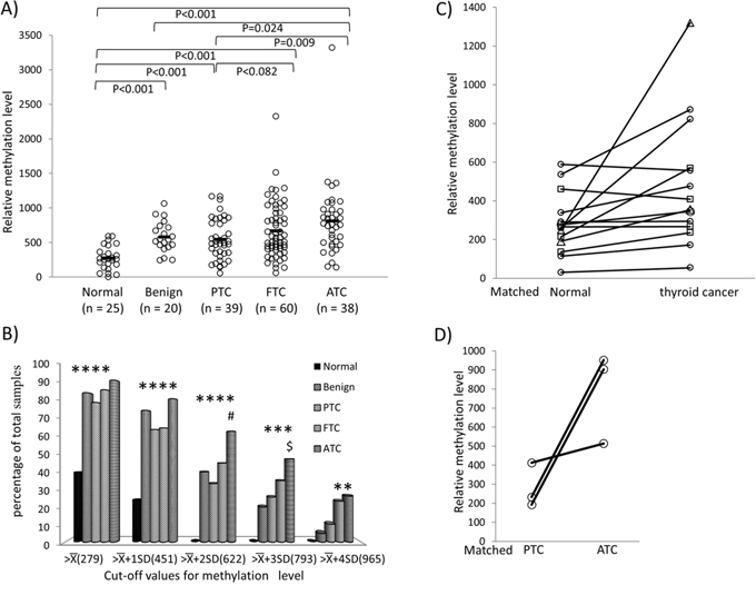 Figure 4: Methylation of REC8 in various thyroid tumors—progression from low- to high-grade tumors. A. Methylation of REC8 in individual cases of various types of thyroid tumor, with progressive increase from low- to high-grade tumors. Each individual case of thyroid sample is represented by a circle. The average methylation level of each type of tissues is indicated with a short horizontal bar. Randomization test was used for calculation of the methylation difference between two types of thyroid samples. B. Prevalence of REC8 methylation (Y-axis) at the indicated relative levels (X-axis) in different types of thyroid tumors and normal thyroid tissues. The average () and standard deviation (SD) of the relative methylation level of REC8 in normal thyroid tissues were 279.41 and 171.28, respectively. As indicated, the values of , +SD, +2SD, +3SD and +4SD were used to group REC8 methylation levels. *p < 0.05 compared with normal samples, #p < 0.05 compared with PTC, $p < 0.05 compared with benign tumor on Fisher’s exact T-test. C. Comparison of REC8 methylation in thyroid cancer and matched normal thyroid tissues. Each individual thyroid sample is represented by a symbol and the matched samples are connected with a black line. Circle, PTC; Rectangle, FTC; Triangle, ATC. D. Methylation of REC8 in paired PTC and ATC that occurred in the same patient. Each individual patient is represented by a circle and the matched samples are connected with a line. PTC, papillary thyroid cancer; FTC, follicular thyroid cancer; ATC, anaplastic thyroid cancer.