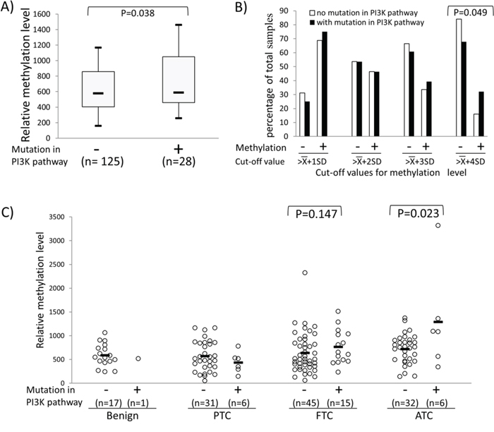 Figure 5: Association between REC8 hypermethylation and genetic alterations in the PI3K/AKT pathway. Genetic alterations in the PI3K/AKT pathway included any mutations in PIK3CA, PTEN and the three RAS genes. We successfully obtained mutation results for the 5 genes in 153 of 157 thyroid tumors tested, which were used in the analysis in this figure. A. REC8 methylation levels in thyroid tumors without or withy mutations in the PI3K pathway. Shown are the Box-Whisker plots of the REC8 methylation levels, with five statistics (lower whisker, lower box part, solid line in box, upper box part, and upper whisker presents 5th, 25th, 50th, 75th and 95th percentile, respectively). Randomization test was used to calculate the p-values for the difference in methylation level between tumor groups. B. Prevalence (Y-axis) of REC8 methylation at the indicated cut-off levels (X-axis) in thyroid tumors with or without mutations in the PI3K pathway. The cut-off methylation values of , , , and used are as described in the legend to Figure 4. C. Relationship between the REC8 methylation and genetic alterations in the PI3K pathway in various types of thyroid tumor. Each individual case of thyroid sample is represented by a circle. Each type of tumors consisted of two groups, one with mutations and the other without mutations in the PI3K pathway as indicated. The average methylation level of each type of tissues is indicated with a short horizontal bar. Randomization test was used to examine the methylation difference between thyroid samples.
