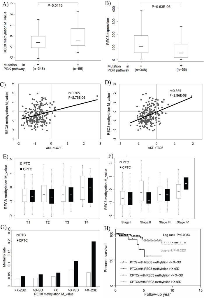 Figure 6: Association of REC8 hypermethylation with genetic alterations/signaling activities of the PI3K pathway and poor clinical outcomes of thyroid cancer in TCGA thyroid cancer database. A. Association between REC8 hypermethylation and genetic alterations in the PI3K pathway in thyroid cancer. The genetic alterations included mutations in PIK3CA, PTEN and the three RAS genes. B. Inverse association between the REC8 mRNA expression and the above genetic alterations in the PI3K pathway. C. Association between REC8 hypermethylation and AKT-pS473 phosphorylation. D. Association between REC8 hypermethylation and AKT-pT308 phosphorylation. E. Association between REC8 hypermethylation and high tumor stages (T, on the TNM classification). REC8 methylation was T1 = −0.626 ± 0.721 vs T4 = -0.008 ± 0.982 (P = 0.047) for all PTC and T1 = -0.663 ± 0.752 vs T4 = -0.051 ± 0.921 (P = 0.087) for conventional PTC (CPTC). F. Association between REC8 methylation and thyroid cancer stages on the American Joint Commission of Cancer staging system. Comparison of REC8 methylation in stages II (−0.688 ± 0.771), III (−0.384 ± 0.708) and IV (−0,141 ± 0.826) with that in stage I (−0.688 ± 0.771) showed P = 0.002434, 0.002224, and 0.000651, respectively, on the analysis of all PTC. Comparison of REC8 methylation in stage III (−0.400 ± 0.650) and stage IV (−0.452 ± 0.650) with stage I (−0.727 ± 0.740) showed P = 0.010 and < 0.001, respectively, on the analysis of CPTC. G. Association between REC8 hypermethylation and thyroid cancer-related patient mortality. Mortality rates (Y-axis) are shown for the indicated REC8 methylation levels (X-axis) in terms of average () and standard deviation (SD) of M values of REC8 methylation, which were -0,453 and 0.813 for all PTC patients and -0.542 and 0.761 for CPTC patients, respectively. REC8 methylation levels were grouped as , , , and , with the mortality rate progressively ring from low to high methylation levels. H. Kaplan-Meier survival curves by the REC8 methylation levels > and ≤ . Comparison of the two groups resulted in P = 0.0083 on the analysis of all PTC and P = 0.0221 on the analysis of CPTC.