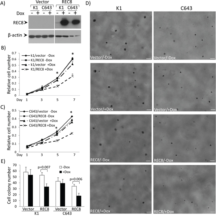 Figure 7: Examination of tumor cell-suppressing functions of the REC8 in thyroid cancer cells. A. Western blotting analysis of inducible expression of REC8 in thyroid cancer cell lines K1 and C643. The procedures for the establishment of doxycycline (Dox)-inducible expression of REC8 in K1 cells and C643 are as described in the Supplementary Materials and Methods. B. Effects of Dox-induced expression of REC8 on the proliferation of K1 cells. C. Effects of Dox-induced expression of REC8 on the proliferation of C643 cells. Cell proliferation was analyzed using MTT assay, in which the OD value was measured every 2 days over a 7-day time course. Results are expressed as means ± SD, n = 4. T-test was used to compare the cell numbers at day 5 and 7 respectively. D. Effects of Dox-induced expression of REC8 on the colony formation of K1 and C643 cells. Scale bar = 200 μm. E. Bar graph presentation of cell colony numbers from 3 experiments (mean ± SD) corresponding to D). *On T test, p < 0.01.