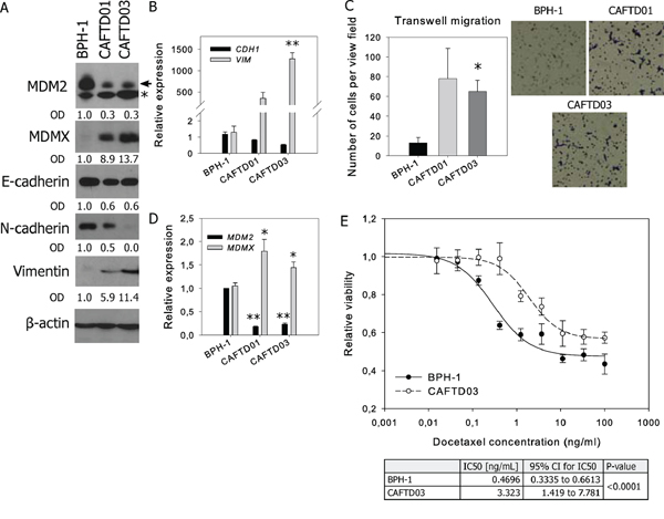 Figure 1: Tumorigenic prostate cell lines with mesenchymal characteristics and increased resistance to docetaxel are characterized by downregulation of MDM2 and upregulation of MDMX. Western blotting and qRT-PCR analysis of MDM2, MDMX, epithelial and mesenchymal markers, and cell migration of human benign prostate BPH-1 cells and two independent tumorigenic clones, CAFTD01 and CAFTD03. A. Images of representative blots are shown; the full length MDM2 protein product is marked by an arrow, a faster-migrating product is marked by an asterisk (Supplementary Figure S1B). Relative protein expression was evaluated by measuring optical density (OD). B–C. PCR data represent mean ± SEM. (B) **P < 1.10−3 to BPH-1 cells, n = 3 (C) *P < 0.05, **P < 1.10−6 to BPH-1 cells, n = 7. D. Migration results through an uncoated 8 μm-pore transwell represent the average number (mean ± SD) of migrating cells in five independent viewing fields after 6 h of migration, from 3 independent experiments in technical duplicate; *P < 0.01 to BPH-1 cells. Photographs show results of a representative experiment at 40× magnification. E. Viability of BPH-1 and CAFTD03 cells treated with docetaxel for 72 h was analyzed using a luminescence-based ATP assay. Graphs show data from a representative experiment in technical triplicate. IC50 values were calculated from 3 independent experiments.