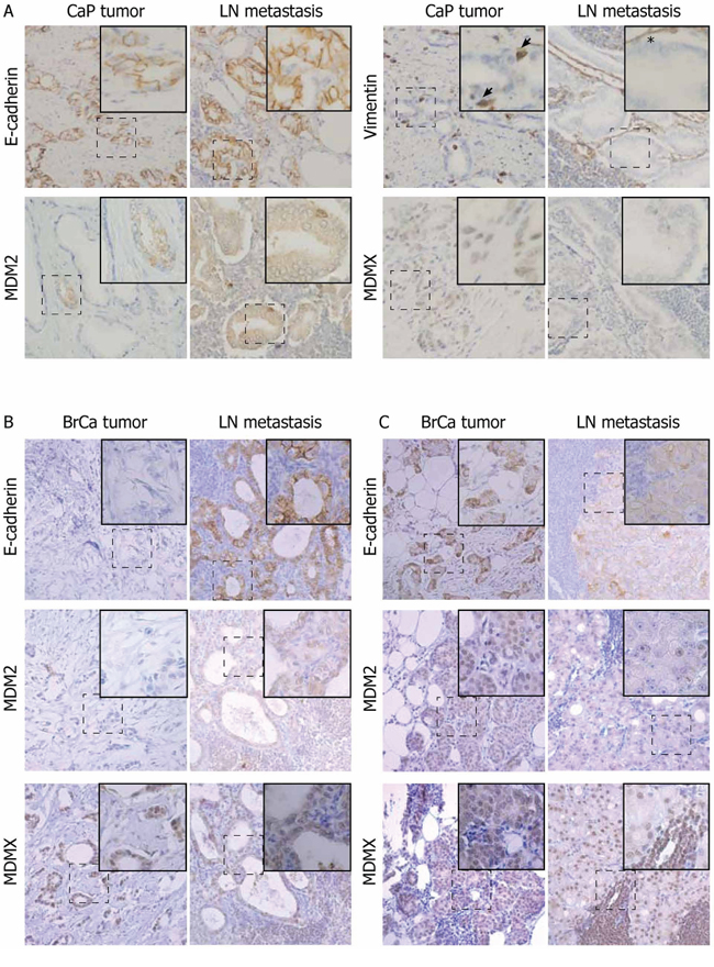 Figure 3: Changes in MDM2 and MDMX protein expression correlate with EMT in a proportion of paired patient prostate and breast tumors and metastases. Paired patient samples from primary tumors and LN metastases were stained with the indicated antibodies. LN metastases of CaP A. exhibit a more epithelial phenotype compared to the primary tumor from the same patient. Arrows show cytosolic vimentin staining indicating EMT; asterisk shows vimentin positivity in the stroma. LN metastases of BrCa demonstrate both MET-like B. and EMT-like C. transitions. Magnification: 20×; dashed boxes indicate region in insets at 40× magnification.