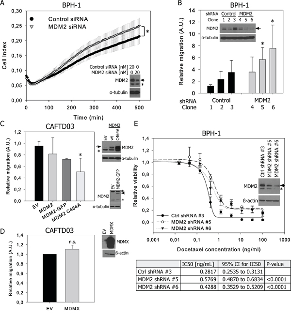 Figure 4: MDM2 expression affects migration and docetaxel sensitivity of prostate epithelial cells. A. BPH-1 cells were transiently transfected with control or MDM2-specific siRNA and cell migration was evaluated by monitoring the impedance signal using a fibronectin-coated CIM module on an xCELLigence DP system. The graph shows the average Cell Index values (mean ± SD) from three independent experiments, *P < 0.05. B. Migration results through an uncoated 8 μm-pore transwell from three independent BPH-1 clones stably transfected with control or MDM2-specific shRNA. C, D. Transwell migration of a pool of CAFTD03 cells transiently overexpressing (C) wt, GFP-tagged or the C464A mutant of MDM2 or (D) MDMX. Graphs represent the relative numbers of migrating cells (mean ± SD) from 3 independent experiments in technical duplicate; *P < 0.05; n.s., P > 0.05. EV, empty vector. E. Viability of stable shRNA-expressing clones from BPH-1 cells treated with docetaxel for 72 h was analyzed using a luminescence-based ATP assay. Graphs show the mean ± SD from 3 independent experiments; IC50 values were calculated from 3 independent experiments.