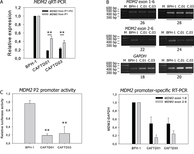 Figure 5: Downregulation of MDM2 in CAFTD clones is driven by transcriptional regulation of two MDM2 promoters. A. qRT-PCR analysis of MDM2 transcripts from untreated BPH-1 cells and two independent CAFTD clones. The assay design represented by black bars detects mRNA products originating from both P1 and P2 promoters, while the assay design represented by grey bars detects only the product of the P1 promoter. **P < 1.10−3 to BPH-1 cells, n = 4 B. Expression of MDM2 transcripts from the P1 and P2 promoter in BPH-1 cells and tumorigenic CAFTD clones was analyzed by semi-quantitative RT-PCR. Sizes of the PCR products are 452 bp for Exon 1-Exon 6 of MDM2, 398 bp for Exon2-Exon 6 of MDM2, and 372 bp for GAPDH, an internal normalization control. The number of amplification cycles is indicated at the bottom of the gel. The graph represents average relative amounts of respective MDM2 transcripts normalized to GAPDH from four independent experiments. C.01 and C.03 refer to the CAFTD clones. C. The activity of the MDM2 P2 promoter was evaluated using a luciferase reporter assay. The cells were transfected with a construct bearing the MDM2 P2 promoter sequence upstream of the firefly luciferase gene, along with a Renilla luciferase internal control (pCIneo RL). The graph represents the mean ± SD of normalized luciferase activity, **P < 1.10−4 to BPH-1 cells, n = 5.