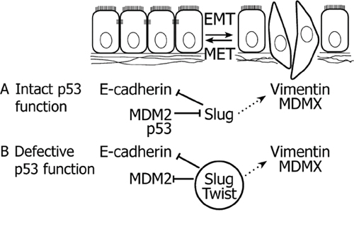 Figure 7: Crosstalk between MDM2, Slug and Twist in EMT. A. In case of intact p53 function, MDM2 cooperates with p53 in the degradation of Slug, thereby preserving the epithelial phenotype. B. When p53 function is impaired, elevated expression of MDM2 correlates with the epithelial phenotype. Slug and Twist inhibit expression of MDM2 and promote EMT, which is associated with upregulated expression of MDMX. Solid lines delineate direct effects, dotted lines represent indirect mechanisms.