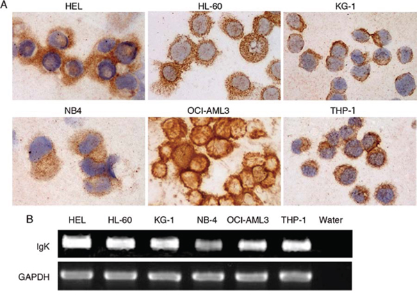 Figure 1: IGK expression in AML cell lines. A. Immunocytochemical study showed IGK expression in all 6 AML cell lines. B. RT-PCR analysis detected IGK transcripts in all 6 AML cell lines.