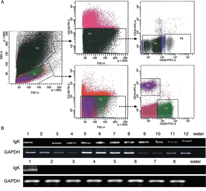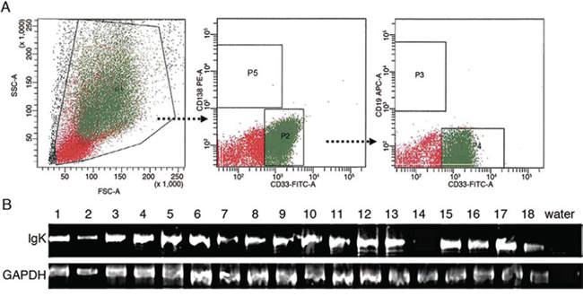 Figure 2: IGK expression in primary myeloblasts. A. Flow cytometry sorting of myeloblasts. P1: mononuclear cells; P2: CD33+CD138− cells from P1; P3: CD19+ cells from P2; P4: CD33+CD19−cells from P2; P5: CD138+ plasma cells. The cells in P4 were defined as CD33+CD19−CD138− myeloblasts. The cells in P3 were used as a positive control. B. RT-PCR analysis detected IGK transcripts in myeloblasts from 17 of 18 AML patients.