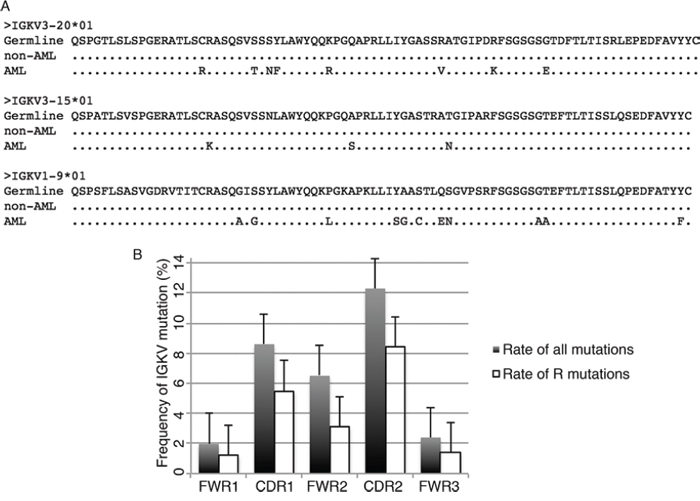 Somatic hypermutation often occurs in the CDR regions of AML-derived IGKV