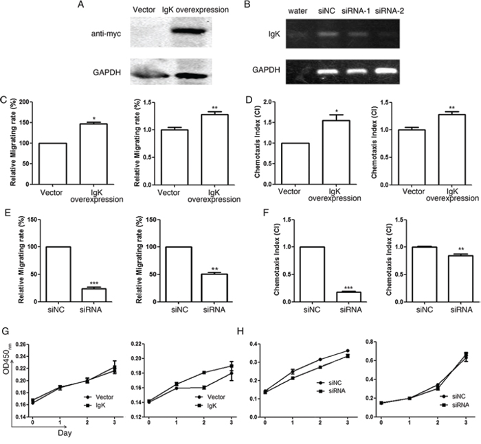 Figure 5: The effect of IGK expression on AML cell migration, chemotaxis and proliferation. A. Western blot analysis with anti-myc antibody showed IGKV1-5*03/IGKJ3*01 (with myc tag) overexpression after transfecting the expression plasmid into HL-60 cell line. B. RT-PCR analysis showed that siRNA-2 had a much higher efficiency to inhibit IGK expression than siRNA-1. siRNA-2 was therefore used in the following knockdown experiments. Water and siNC were used as negative controls. C. The relative migrating rate of HL-60 (left) and NB4 (right) with IGK overexpression, using empty vector as the control. D. The chemotaxis index (CI) of HL-60 (induced by fMLP, left) and NB4 (induced by CXCL12, right) with IGK overexpression, using empty vector as the control. E. The relative migrating rate of HL-60 (left) and NB4 (right) with IGK knockdown by siRNA-2, using siNC as the control. F. The chemotaxis index (CI) of HL-60 (induced by fMLP, left) and NB4 (induced by CXCL12, right) with IGK knockdown using siRNA-2, using siNC as the control. G. The proliferation curves of HL-60 (left) and NB4 (right) with IGK overexpression, using empty vector as the control, assessed by CCK-8 assay. H. The proliferation curves of HL-60 (left) and NB4 (right) with IGK knockdown, using siNC as the control, assessed by CCK-8 assay.