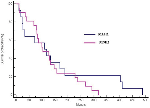 Our study is the first to show a different outcome for patients with different MMR mutations: indeed, our study suggests that overall survival for the group of patients with a less favourable mutation profile is rather poor (10-year survival rate of about 20%). If we compare this result with the10-year survival rate of mutation-negative patients included in the analysis (about 30%) it is easy to refuse the claim that all MMR mutations have the same prognostic impact. Indeed, survival advantage remained remarkable only for subject with a MMR pathogenic missense and splicing site mutation.
