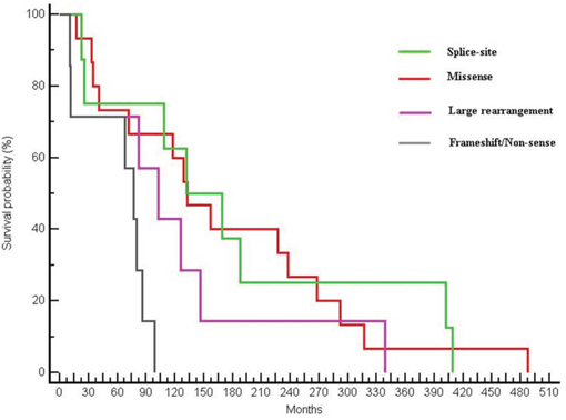 Figure 3: Differences in OS between patients with different types of mutations (OS of 132.46 months in patients with a missense mutation, 150.46 months for patients with a splice-site mutation, 102.62 months for patients with a large rearrangement and 77.31 months in patients with a frameshift or non-sense mutation; p = 0.0224).