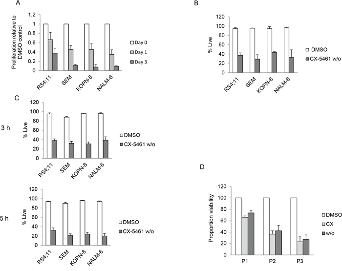 Figure 1: Transient inhibition of rRNA synthesis affects cell proliferation. A. Four ALL cell lines were treated with 250 nM CX-5461 or DMSO for 24 h. Cells were washed and equal number of CX-5461 or DMSO treated cells were seeded in drug free medium in 96 well plates and cell proliferation was measured at Day 1 and 3. Data is normalized to the growth in DMSO treated samples. All four ALL cell lines show time dependent decrease in proliferation relative to their DMSO treated controls. Data represents mean +/− S.D. of three independent experiments. B. Cells were treated as in (a) and cell death was measured three days after washout by propidium iodide staining (PI). Data represent mean +/− S.D. of three independent experiments. C. Cells were treated for 3 hours or 5 hours with CX-5461 (500 nM for NALM-6 and 250 nM for SEM, KOPN-8 and RS4;11) or DMSO followed by washing. Cells were incubated in drug free media and cell viability was measured using trypan blue after three days. Drug washout cells show reduced viability compared to control treated cells. Data represent mean +/− S.D. of three independent experiments. D. Three ALL patient samples were treated with 1 μM CX-5461 or DMSO for 5 hours. After 5 hours the CX-5461 treated cells were washed, incubated with either DMSO (w/o) or 1 μM CX-5461 (CX); the DMSO treated cells were washed and incubated in DMSO (DMSO). After 2 days, cell death was measured using PI staining. All three patient samples, continuously or transiently treated with CX-5461, showed reduced viability compared to DMSO treated control. Viable proportion is plotted from duplicate experiments.