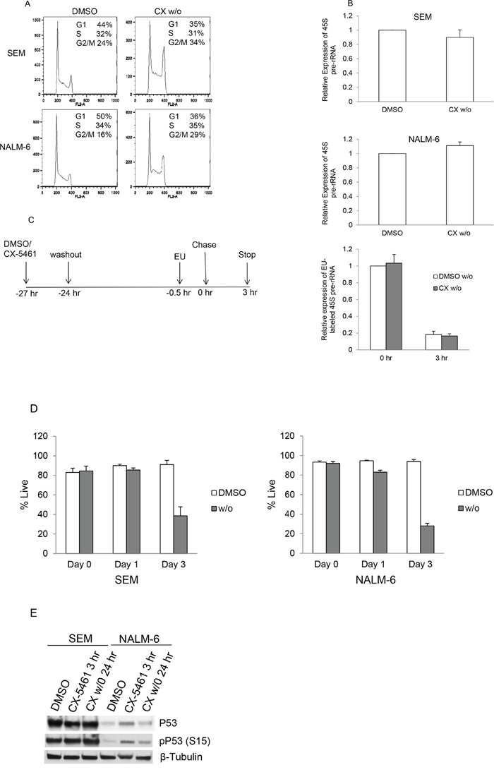 To further investigate changes induced by transient treatment, we treated SEM and NALM-6 cells with CX-5461 for 3 hours, washed twice and resuspended them in drug free media. We then investigated the effects of drug washout on cell-cycle distribution, rRNA synthesis and cell viability. Cell-cycle results show that 24 hours after washout (CX w/o), cells show an increase in the G2/M population compared to control treated cells, although the magnitude of the increase is less than that seen with continuously treated cells (CX-5461) (Figure 2A and Supplementary Figure 1A). We used 45S pre-rRNA transcript levels, which are known to have a very short half-life (several minutes), as a measure of the rate of rRNA synthesis. We have shown previously that 250 and 500 nM CX-5461 reduces pre-rRNA synthesis by more than 50% by 3 hours in SEM and NALM-6 cells respectively [19]. We first measured 45S pre-rRNA levels at 3 hours after CX-5461 treatment to confirm inhibition of RNA pol I transcription (Supplementary Figure 1B). The cells were then washed and suspended in drug free media for 24 hours to check if pre-rRNA synthesis recovered following washout. Both cell lines showed significant pre-rRNA synthesis inhibition at 3 hours (CX 3 h) and almost complete recovery at 24 hours after washout (CX w/o) (Figure 2B and Supplementary Figure 1B). Ribosome biogenesis is a highly coordinated process and inhibition of rRNA synthesis can lead to pre-rRNA processing defects. In order to make sure that the increase in the levels of 45S pre-rRNA in drug washout cells is not due to pre-rRNA processing defects, we labeled SEM cells with ethynyl uridine (EU) for 30 min followed by chase in EU free media. RNA was isolated at 0 and 3 hours after EU washout from the cells. Newly synthesized EU labeled transcripts were isolated as described in materials and methods. Our results show no difference in the levels of newly transcribed 45S pre-rRNA in DMSO and CX-5461 washout cells at 0 hour (Figure 2C). Moreover, 3 hours after chase, levels of the EU labeled 45S pre-rRNA decreases substantially. The decrease was similar in both DMSO and CX-5461 washout cells suggesting efficient processing of 45S pre-rRNA transcript under both conditions.