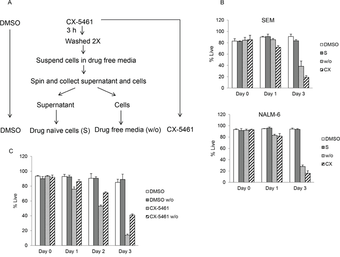 Figure 3: Washout procedure completely removes drug from the media. A. Schematic of drug treatment experiment in (b). SEM and NALM-6 cells were continuously treated with DMSO or with 250 or 500 nM CX-5461 (CX) respectively. A portion of CX-5461 treated cells was harvested after 3 hours, washed twice and incubated in drug free media. After second wash, cells were suspended in drug free medium and spun again. Resulting supernatant was collected and added to drug naïve cells (S) while the cells pellet was suspended in fresh media (w/o). B. Cell viability was measured immediately after washout and at day 1 and 3 with trypan blue staining. Experiment was performed three times and mean +/− S.D. is plotted. C. SEM cells were continuously incubated in DMSO or CX-5461 and a portion was harvested after 3 hours followed by washing in drug free media as before. Cell viability was measured using trypan blue staining at day 0, 1, 2 and 3 after washout. Results are plotted as mean +/− S.D.