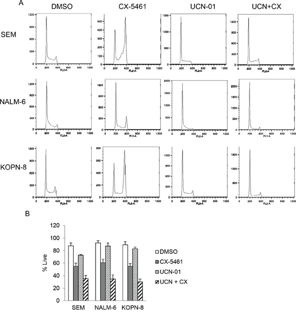 In addition to transient treatment with CX-5461, we investigated other rational drug combinations that can potentiate the effect of continuous CX-5461 treatment. We have previously shown that CX-5461 activates ATM/ATR pathway in acute leukemia, arrests cells in G2 phase and synergizes with ATR inhibitor in killing these cells [19]. We hypothesized that abolishing cell-cycle arrest in the G2 phase would result in inadequate recovery from cellular stress and lead to increased cell death. Checkpoint kinases 1 and 2 (CHK1/2) are downstream effectors of ATM/ATR pathway and are activated upon CX-5461 treatment [19]. UCN-01, a staurosporine analogue, is a potent inhibitor of CHK1/2 and sensitizes tumor cells to genotoxic agents by abrogating G2 arrest induced by these drugs [23, 24]. Although UCN-01 is an inhibitor of the protein kinase C (PKC) family of enzymes, G2 checkpoint abrogation by inhibiting checkpoint kinases play a major role in its anticancer activity [25, 26, 27]. To determine if UCN-01 can abrogate CX-5461 induced G2 arrest, we pre-treated cells with UCN-01 followed by continuous CX-5461 treatment for 24 hours. Cell-cycle analysis shows that CX-5461 treatment induced G2 arrest in SEM, KOPN-8 and NALM-6 cells. This arrest was completely abolished by UCN-01 pre-treatment (Figure 4A). We then investigated if UCN-01 treatment will enhance the cytotoxicity of CX-5461 as seen previously in combination with ATR inhibitor. We pre-treated cells with UCN-01 for 1 hour followed by CX-5461 and measured cell viability using trypan blue. Combination treatment with CX-5461 and UCN-01 significantly reduced cell viability in all three cell lines compared to CX-5461 or UCN-01 treatment alone (Figure 4B).