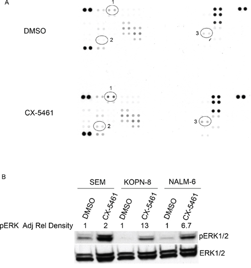 Figure 5: CX-5461 activates MAPK signaling pathway. A. SEM cells were treated with 250 nM CX-5461 or DMSO for 1 day. Proteome profiler human phospho-kinase array was incubated with equal amount of control or drug treated sample. Results show an increase in pERK (1), pCHK2 (2) and HSP60 (3) signal in CX-5461 treated cells compared to DMSO treated control. B. Increase in pERK signal was confirmed with western blot of CX-5461 treated SEM, NALM-6 and KOPN-8 cells. Adjusted relative density of pERK signal normalized to corresponding DMSO treated control is indicated.