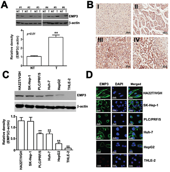 Figure 1: EMP3 is highly expressed in tissue sections from HCC patients and in HCC cell lines. A. The expression of EMP3 was examined by immunoblotting. Upper panel: the representative results of the amounts of EMP3 in paired non-tumorous (NT) and tumorous (T) tissue samples from clinical HCC patients. Lower plot: the relative amounts of EMP3 normalized by β-actin from 16 NT/T paired HCC tissues. **, P < 0.01, compared with that of the non-tumorous (NT) tissues. B. The representative IHC staining of EMP3 from normal tissues (I) and different differentiated HCC tumorous (II-IV). Scale bars = 100 μm. C. The protein expression levels of EMP3 in different differentiated HCC cell lines, including poor differentiated HA22T/VGH and SK-Hep-1, and moderate differentiated PLC/PRF/5 and Huh-7, well differentiated HepG2 cells, and normal hepatic THLE-2 cells. The bottom plot was the quantitative amounts of EMP3 normalized by β-actin in each cell line from three independent experiments. D. The IF staining of EMP3 (green color) and DAPI staining of nucleus (blue color) in each cell line. Scale bars = 50 μm. Data are presented as the mean ± SE of at least three independent experiments. **, p < 0.01.