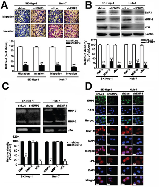 Figure 3: Knockdown of EMP3 inhibits the abilities of migration and invasion of HCC cells through down-regulation of MMP-9 and uPA. A. Upper plot: the representative results of the in vitro migration and invasion assay. Lower plot: the relative abilities of migration and invasion of shEMP3 cells was compared to that of shLuc cells. B. The protein expressions of EMP3, MMP-9, and uPA were examined by immunoblotting. β-actin was an internal control. The relative amount of indicated protein was shown in the bottom plot from 3 independent experiments. C. Upper panel: the proteolytic activity was examined by zymography. Lower plot: the relative density of proteolytic band of MMP-9, MMP-2, and uPA from 3 independent experiments. D. The IF staining of EMP3 (green), MMP-9 (red), and uPA (red) and DAPI staining of nucleus (blue color) in each cell line. Scale bars = 50 μm. Data are presented as the mean ± SE of at least three independent experiments. **, p < 0.01.