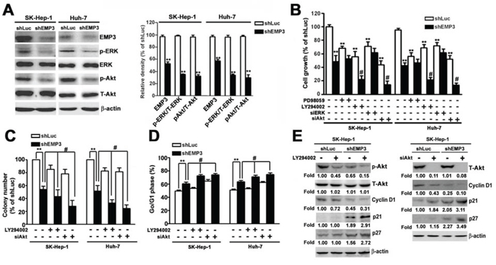 Figure 4: Knockdown of EMP3 suppresses cell proliferation of HCC cells mainly through inactivation of PI3K/Akt pathway. A. The expressions of indicated proteins were examined by immunoblotting. The relative amounts of indicated proteins in shEMP3 cells comparing to that in shLuc-infected cells were shown in the right plot. B. Cells were treated with or without 30 μM of PD98059 (a MEK inhibitor), or 30 μM of LY294002 (a PI3K inhibitor) for 2 h, or transfected with siRNA towards ERK or Akt, and then the cell growth was determined by MTT assay. C. Cells were treated with or without 30 μM of LY294002, or transfected with siRNA towards Akt. The clonogenic ability was examined by colony formation assay. The bottom plot was the quantitative results. D. Cell cycle was determined by flow cytometer. The percentage of cells distributed at G1 phase. The expressions of indicated proteins were examined by immunoblotting in E. Data are presented as the mean ± SE of at least three independent experiments. *, p < 0.05, **, p < 0.01 compared to the expression levels in shLuc cells; #, p < 0.01 compared to the expression levels in untreated shEMP3 cells.