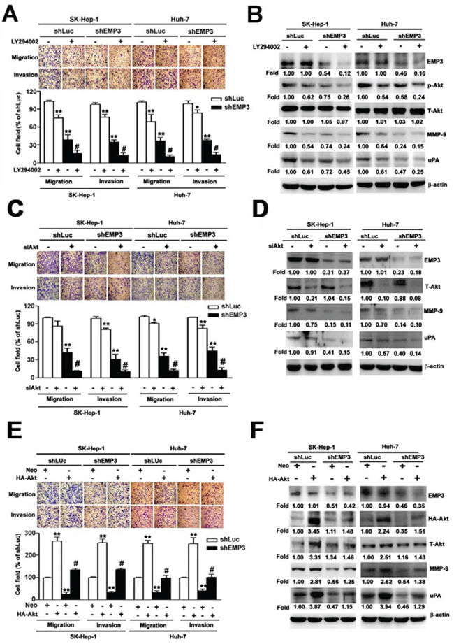Figure 5: PI3K/Akt pathway regulates MMP-9 and uPA in EMP3-mediated cell migration and invasion of HCC cells. A, B. Cells were treated with or without 30 μM of LY294002 for 2 h. C, D. Cells were silenced by the siRNAs against mock (neo) or Akt (siAkt). E, F. Cells were transfected and overexpressed with mock (neo) or HA-tagged Akt (HA-Akt) plasmid. The migratory and invasive abilities were examined in A, C, and E. The upper plots were the representative results of the in vitro cell migration and invasion assay. The relative abilities of migration and invasion were shown in the lower plots. B, D, F. The expressions of indicated proteins were determined by immunoblotting. Data are presented as the mean ± SE of at least three independent experiments. **, p < 0.01 comparing to that of shLuc cells; #, p < 0.01 comparing to that of untreated shEMP3 cells.