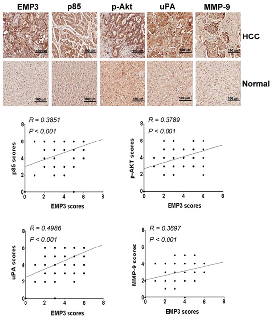 EMP3 is clinical relative to the expression of p85, p-AKT, MMP-9, and uPA in the tissue sections from HCC patients