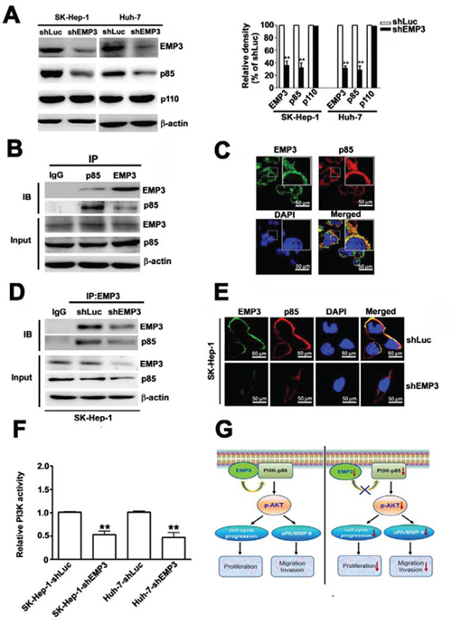 Figure 7: Knockdown of EMP3 reduces the expression and activity of PI3K in SK-Hep-1 cells and the proposed roles of EMP3 in HCC proliferation and invasion. A. The protein amounts of EMP3, p85 regulatory subunit and p110 catalytic subunit of PI3K, and β-actin were determined by immunoblotting. The quantitative amounts of indicated proteins were shown in the right plot. B. The association between EMP3 and p85 in SK-Hep-1 cells was examined by the reciprocal immunoprecipitation (IP) / immunoblotting (IB) with anti-EMP3 and anti-p85 antibodies as indicated in the upper panel. The lower panel showed the input of the indicated protein in cell lysate. C. The localization of EMP3 (green) and p85 (red) in SK-Hep-1 cells were determined by IF staining. The cell nucleus was stained with DAPI (blue). D. The association of EMP3 and p85 in shLuc-SK-Hep-1 cells and in shEMP3-SK-Hep-1 cells were examined by IP/IB against EMP3 and p85, respectively. The lower panel showed the input of the indicated protein in cell lysate. E. The localization of EMP3 (green) and p85 (red) were determined by IF staining and cell nucleus was stained with DAPI (blue) in SK-Hep-1 cells. F. The relative kinase activity of PI3K was shown. G. The role of EMP3 in cell proliferation and invasion of HCC was illustrated. Left plot: EMP3 associates with PI3K-p85 involved in activation of PI3K/Akt pathway to promote cell cycle progression and proliferation, and also to enhance uPA/MMP-9 required for migration and invasion in HCC cells. Right plot: targeting EMP3 with shRNA to decrease the level of EMP3 results in reduction of PI3K-p85 and inactivation of PI3K/Akt, which contribute to inhibition of cell proliferation and suppression of migration and invasion by down-regulation of uPA/MMP-9 cascade in HCC cells. Data are presented as the mean ± SE of at least three independent experiments. **, p < 0.01. Scale bars = 50 μm.