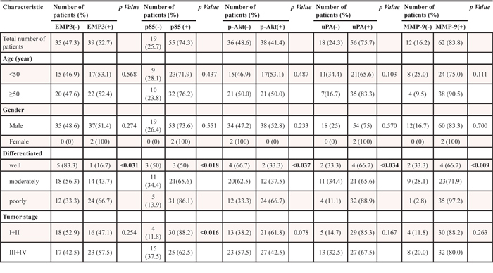 Table 1: Expression of EMP3, p85, p-Akt, uPA, MMP-9 in relation to patient characteristics and pathological features of hepatocellular carcinoma