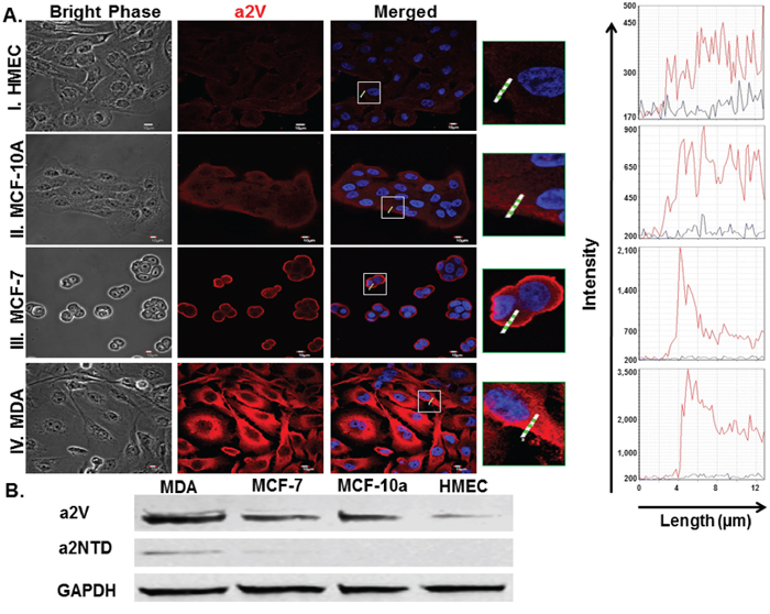 Figure 1: Expression of a2V and a2NTD in breast cancer cells. Immunofluorescent analysis of a2V expression A. in human non-cancerous mammary epithelial cell lines, HMEC (I.), MCF-10A (II.) and in breast cancer cell lines, MCF-7 (III.), MDA-MB-231 (MDA) (IV.); 2.5 × 104 cells were cultured in 8 well chamber slides, fixed by 4% paraformaldehyde, permeabilized and fluorescently stained by 2c1 antibody (red) and DAPI nuclear staining (blue), examined by confocal microscopy. Histograms represent the Intensity of the staining of the white highlighted region crossing the cells. Original magnification 600 ×; scale bars; 10 μm. Representative images from four independent experiments are shown. B. Cell lysates from the four mammary epithelial cell lines were immunoblotted using 2C1 antibody, anti-a2NTD antibody and GAPDH antibody (as endogenous control) (n = 6).