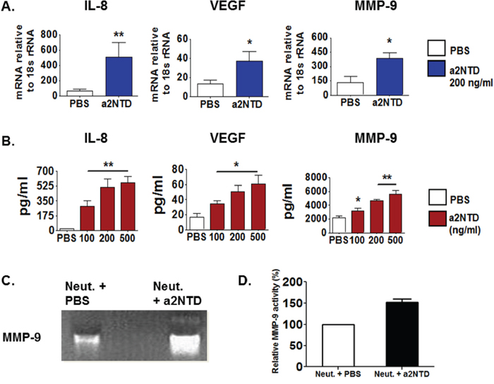 The secreted protein levels of IL-8, VEGF and MMP-9 were detected by multiplex Luminex assay using neutrophils supernatant collected after overnight incubation with a2NTD. Similarly, the secreted protein levels of these mediators (Figure 4B) were elevated substantially upon a2NTD treatment (IL-8: 561.7 ± 73.2, VEGF; 60.6 ± 11.9, MMP-9; 5,631 ± 529) as compared with PBS-treated neutrophils (IL-8; 19.3 ± 6.1, VEGF; 16.3 ± 5.5, MMP-9; 2,149 ± 209) (p < 0.01, p < 0.05 for VEGF).