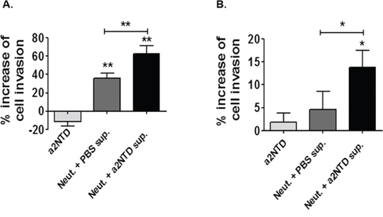 Figure 6: a2NTD stimulated neutrophils enhance breast cancer cell invasion. The trans-well invasion assay was carried out on using MDA-MB-231 A. and MCF-7 B. cell lines. 1 × 104 tumor cells were plated on a basement membrane matrix coated inserts (24 well plates, 8 μm pore size) in serum free media. Tumor cells were either suspended in media + PBS (control), media + a2NTD (a2NTD), neutrophil supernatant (Neut. + PBS sup.) or a2NTD treated neutrophil supernatant (Neut. + a2NTD sup). Results were collected from 3 individual experiments and are reported as the mean of percentage increase in invasion relative to control ± SEM. *P < 0.05, **P < 0.01.