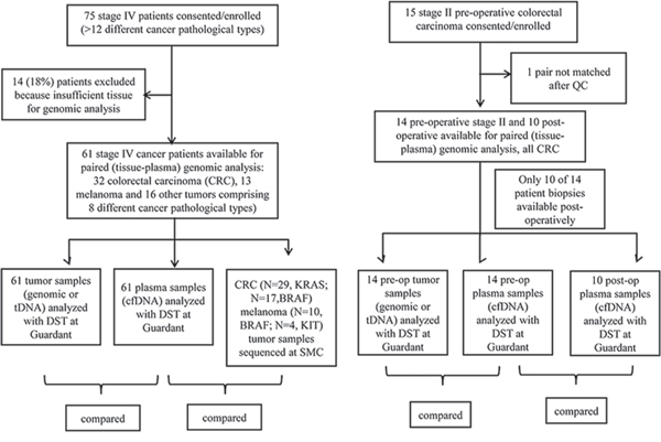 The institutional review board of the Samsung Medical Center (SMC) approved the study. All study participants provided written informed consent before study entry. Briefly, consented patients with metastatic cancer eligible for clinical trial enrollment or chemotherapy based on genomic biomarkers were eligible to enter the study. Patients with pathologically confirmed cancer and who had either archived tissue or fresh tissues were eligible for genomic analysis. The STARD flow diagram for in this study was summarized in Figure 1 [15]. For stage II colorectal cancer patients, baseline blood for cfDNA at the time of surgery in the operation room and at postoperative 7-day follow-up sample were drawn. For this patient cohort, surgical specimens were procured at the time of surgery for tDNA analysis.