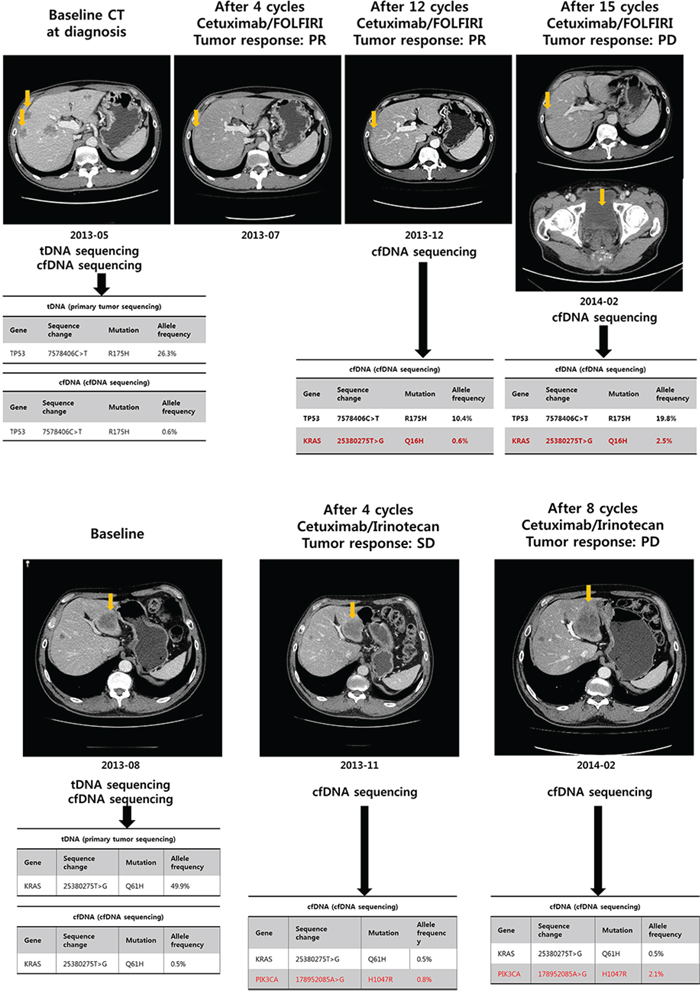 A 55 year-old man was diagnosed with metastatic CRC at SMC. The major metastatic lesions were hepatic, and also involved abdominal and presacral lymph nodes. Before starting systemic chemotherapy, mutational profiles of both primary tumor tissue and plasma were evaluated. Both tumor DNA and cfDNA sequencing demonstrated TP53 mutation and KRAS wild type (Figure 3A). cfDNAs were collected before cetuximab/FOLFIRI (5-FU/irinotecan/leucovorin) treatment, and at the time of computed tomography (CT) evaluation (every 4 cycles) thereafter. After 4 cycles of cetuximab/FOLFIRI chemotherapy, the follow-up CT scan revealed tumor shrinkage corresponding to partial response based on RECIST 1.1 criteria (Figure 3A). The patient continued to receive the same regimen for 6 months without definite radiologic or clinical progression. After 12 cycles of cetuximab/FOLFIRI, new KRAS mutation emerged in the patient's plasma cfDNA without evidence of radiologic progression. After 1.5 months from the time of newly emerged KRAS mutation emergence in cfDNA, the patient exhibited radiologic progression with sacral metastasis, showing persistence of the KRAS mutation in cfDNA (Figure 3A). Another patient with KRAS Q61H mutant on both tDNA and cfDNA had stable disease and a reduction in the cfDNA KRAS Q61H mutant allele frequency from 49.9% to 0.5% after four cycles of cetuximab/irinotecan (Figure 3B). However, this patient had a newly emerged PIK3CA H1047R mutation on cfDNA analysis at 2 months of cetuximab/irinotecan chemotherapy with allele frequency of 0.8%. Because the treatment response was within stable disease per RECIST 1.1 criteria, the patient received 4 more cycles of cetuximab/irinotecan. At 4 months CT evaluation (after 8 cycles), the patient had definite radiologic progression with enlarging liver metastases and parallel increase in allele frequency of PIK3CA H1047R mutation to 2.1%.