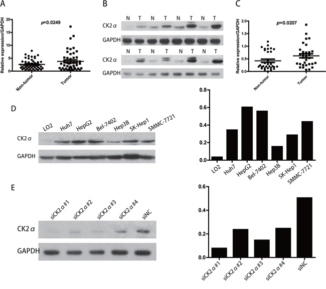 Figure 1: Expression level of CK2α mRNA and protein in human primary HCC cell lines and surgical specimens as evaluated by RT-qPCR and Western blot. A. RT-qPCR showed that relative CK2α mRNA expression was higher in 47 HCC tissues than in matched adjacent non-cancerous tissues (P = 0.0249). B. Representative Western blot results showed that the expression of CK2α protein in eight HCC tissues was significantly higher than that in matched adjacent non-cancerous tissues (N, non-tumor, T, tumor). C. Relative expression of CK2α protein was increased remarkably in 31 HCC tissues compared with matched adjacent non-cancerous tissues (P = 0.0207). D. CK2α protein was up-regulated in Huh7, HepG2, BEL-7402, Hep3B, SK-Hep1 and SMMC-7721 cells (particularly in Bel-7402 and HepG2 cells) compared with the normal liver cell line LO2. E. Among the four tested siRNAs against CK2α, siCK2α#1 and siCK2α#3 showed higher knockdown efficiencies.