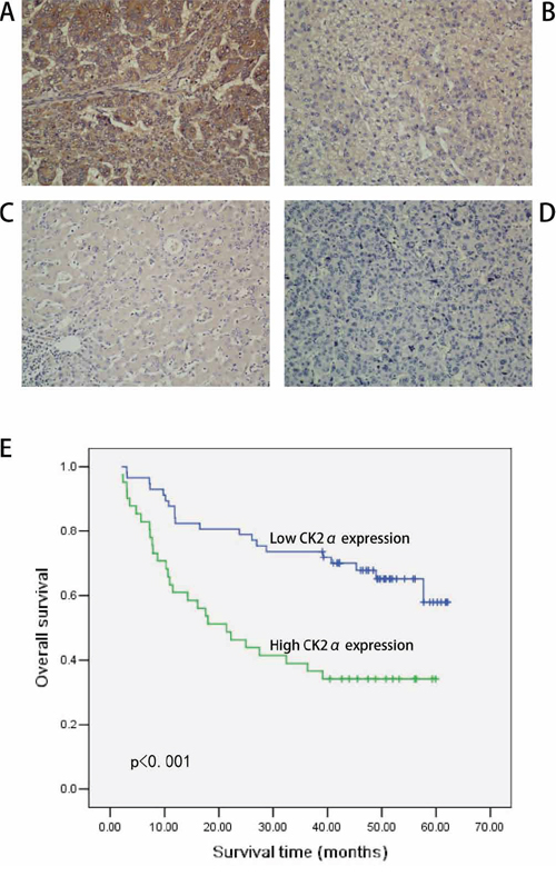 Figure 2: IHC analyses of CK2α protein expression in primary HCC surgical specimens and Kaplan–Meier survival analyses of the primary HCC patients (n = 98). A. Strong CK2α staining in HCC, scored as CK2α (+++). B. Moderate CK2α staining in HCC, scored as CK2α (++). C. Weak CK2α staining in HCC, scored as CK2α (+). D. CK2α-negative staining in HCC, scored as CK2α (-). All images are shown at × 200 magnification. E. Based on CK2α immunostaining analysis of their tumors, HCC patients were divided into low-CK2α expression (n = 56, CK2α- or CK2α+) and high-CK2α expression (n = 42, CK2α++ or CK2α+++) groups. Survival of patients in the low-CK2α group was significantly higher than that of patients in the high-CK2α group (P < 0.001, log-rank test).