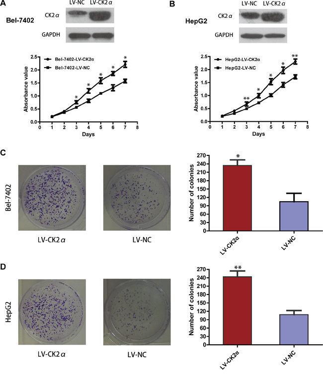 Recombinant lentiviruses overexpressing CK2α (LV-CK2α) and negative control vector (LV-NC) were obtained from GenePharma (Suzhou, China). Lentiviral infection was performed by adding virus solution to HepG2 and Bel-7402 cells in the presence of 5 μg/mL polybrene (Sigma-Aldrich, St. Louis, MO). After infection for 48 h, the cells were selected in the presence of 3 μg/mL puromycin, and puromycin-resistant cells were pooled and cultured for further analysis. The stable cell lines were designated as HepG2-LV-CK2α, HepG2-LV-NC, Bel-7402-LV-CK2α, and Bel-7402-LV-NC, respectively.