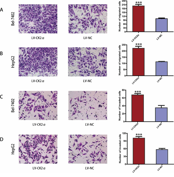 Figure 6: CK2α overexpression promoted hepatoma cell migration and invasion. A, B. CK2α overexpression using specific recombinant lentiviral vector promote the migration ability of Bel-7402 (A) and HepG2 (B) cells in a Transwell migration assay. C, D. CK2α overexpression using specific recombinant lentiviral vector remarkably increase the invasion ability of Bel-7402 (C) and HepG2 (D) cells in a Matrigel invasion assay. All images are shown at ×200 magnification. Data are presented as the mean ± SD of three independent experiments. P-values were calculated using the independent Student's t-test. ***P < 0.001 versus control.