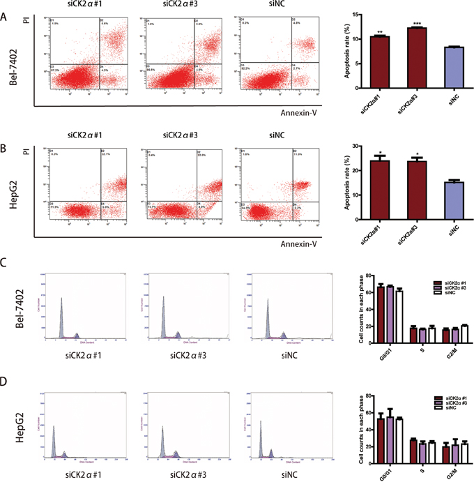 Figure 7: Effect of CK2α on apoptosis and cell cycle in HCCs. A, B. CK2α silencing by siRNAs of Bel-7402 (A) and HepG2 (B) cells significantly increased cell apoptosis. *P < 0.05 versus control; **P < 0.01 versus control; ***P < 0.001 versus control. C, D. Cell-cycle distribution was not changed significantly between Bel-7402 (C) and HepG2 (D) cells transfected with CK2α-specific siRNAs and siNC. *P < 0.05 versus control. Data are presented as the mean ± SD of three independent experiments.