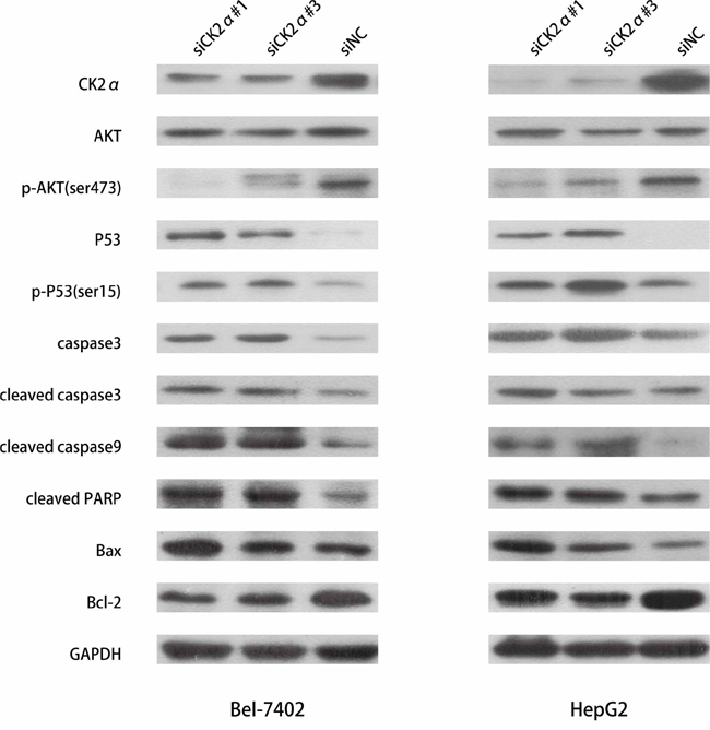 Figure 8: Detection of apoptosis-related proteins by western blotting. Downregulation of expression of p-AKT (ser473) and Bcl-2 were detected in CK2α-knockdown Bel-7402 and HepG2 cells. The expression of P53, p-P53 (ser15), caspase3, cleaved caspase3, cleaved caspase9, cleaved PARP, Bax were increased in CK2α-knockdown Bel-7402 and HepG2 cells.