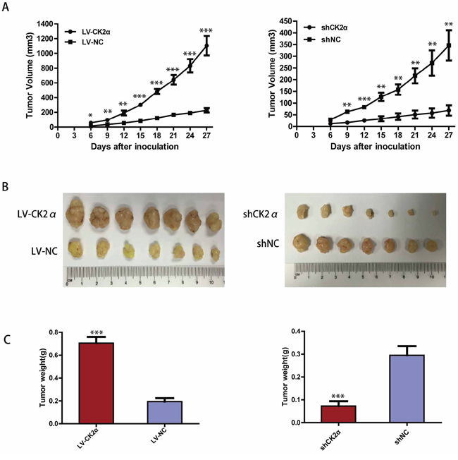Figure 9: CK2α increase the tumorigenicity of HCC in vivo. A. The tumor growth curves for each group. The tumor growth rate was elevated in the tumors that overexpressed CK2α (left) and reduced in the tumors that CK2α-silenced (right). B. Photographs of dissected tumors from the nude mice. The final tumor volumes were larger in the tumors that overexpressed CK2α (left) and smaller in the tumors that CK2α-silenced (right) than that in the control group. C. The tumor weights of each group. The final tumor weights were increased in the tumors that overexpressed CK2α (left) and decreased in the tumors that CK2α-silenced (right). P-values were calculated using the independent Student's t-test. *P < 0.05 versus control; **P < 0.01 versus control; ***P < 0.001 versus control.