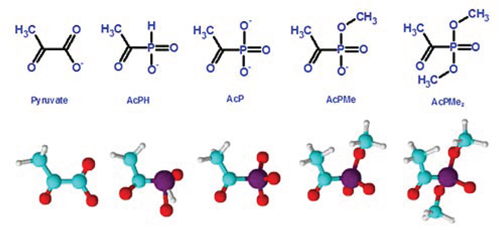 Figure 1: Structures of pyruvate and its synthetic analogs with the phosphinate or phosphonate group substituting for the leaving carboxyl group. The anions existing at physiological pH are shown. AcPH, acetyl phosphinate; AcP, acetyl phosphonate; AcPMe, methyl ester of acetyl phosphonate; AcPMe2, dimethyl ester of acetyl phosphonate.
