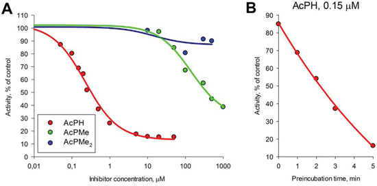 Figure 2: Inhibitory action of AcPH, AcPMe and AcPMe2 on isolated PDHC. The reaction was started with 2 mM pyruvate after PDHC from rat heart had been preincubated at 37°C in 50 mM MOPS buffer (pH 7.6) containing 1 mM MgCl2, 1 mM CaCl2, 1 mM ThDP, 0.05 mM CoA, 2.5 mM NAD+, 1 mM DTT and indicated inhibitor concentrations. A. Concentration dependences of PDHC activity on the indicated inhibitors after 1 min preincubation. Non-linear regression to a hyperbolic function was made using SigmaPlot 12.0. B. Time-dependent inhibition of the overall PDHC activity by AcPH. PDHC was preincubated as described above with 0.15 μM AcPH, followed by the reaction start with 2 mM pyruvate at the indicated times. Velocities were measured from the linear part of the product accumulation curves during 0.5–3.5 min of the reaction. Inhibition is presented as % of control activity in the absence of AcPH. Non-linear regression to an exponential decay function was made using SigmaPlot 12.0.