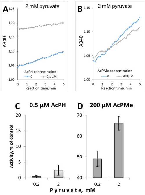 Figure 3: Irreversibility of PDHC inhibition upon preincubation with AcPH and AcPMe. Assays were performed at 37°C in 30 mM potassium phosphate (pH 7.0) containing 3 mM NAD+, 0.05 mM CoA, 2 mM DTT, 0.4 mM ThDP, 2 mM MgCl2 and indicated concentrations of pyruvate and inhibitors. A, B. Representative product accumulation curves in the presence or absence of the pyruvate P-analogs. Reactions were started by addition of 2 mM pyruvate after PDHC was preincubated for 5 min at 37°C in pyruvate-free assay medium without (grey triangles) or with (blue diamonds) the inhibitors indicated on the figures. C, D. Dependence of inhibition by AcPH or AcPMe on pyruvate added after 5 min preincubation with the inhibitors.