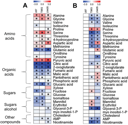 Figure 6: Comparative metabolic profiling of glioblastoma cell lines treated with 0.5 mM AcPH for 5.5 h (a) and under control conditions (B). A. Fold changes in the metabolite levels of AcPH-treated T98G, U87 or LN405 cell lines, compared to untreated controls. B. Metabolic difference between untreated cell lines is presented as the fold changes in metabolite levels of the T98G or LN405 lines, compared to the U87 line.