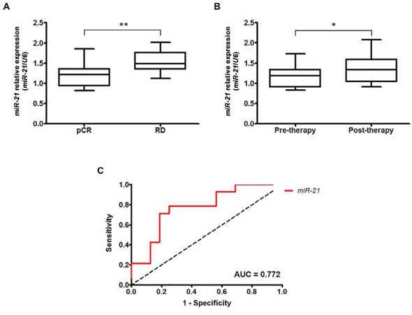 Figure 1: Overexpression of miR-21 in HER2-overexpressing breast cancer is associated with trastuzumab and chemotherapy resistance. A. MiR-21 is significantly overexpressed in patients with RD compared with patients who achieved pCR (p = 0.012). B. miR-21 expression was significantly higher in HER2-positive patients after trastuzumab and chemotherapy treatment (p = 0.016). *p < 0.05; **p ≤ 0.01. C. The ROC analysis demonstrated that miR-21 expression was able to discriminate patients with pCR from those with RD with high accuracy (AUC = 0.772).