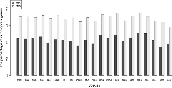 For SM and FM genes, we calculated the numbers of the one-to-one orthologous genes in each of the 21 species. The results are displayed as a bar chart in Figure 1, which shows that the bar chart of the SM genes is higher than that of the FM genes. We also used the Wilcoxon signed rank test to test the statistical significance. The null hypothesis is that the SM genes and the FM genes had the same percentage of orthologous genes in each of the 21 species. The P-value was 9.54E-07 and the significance level α was 0.05. This indicated that the SM genes had a higher percentage of orthologous genes than FM genes across the 21 species.